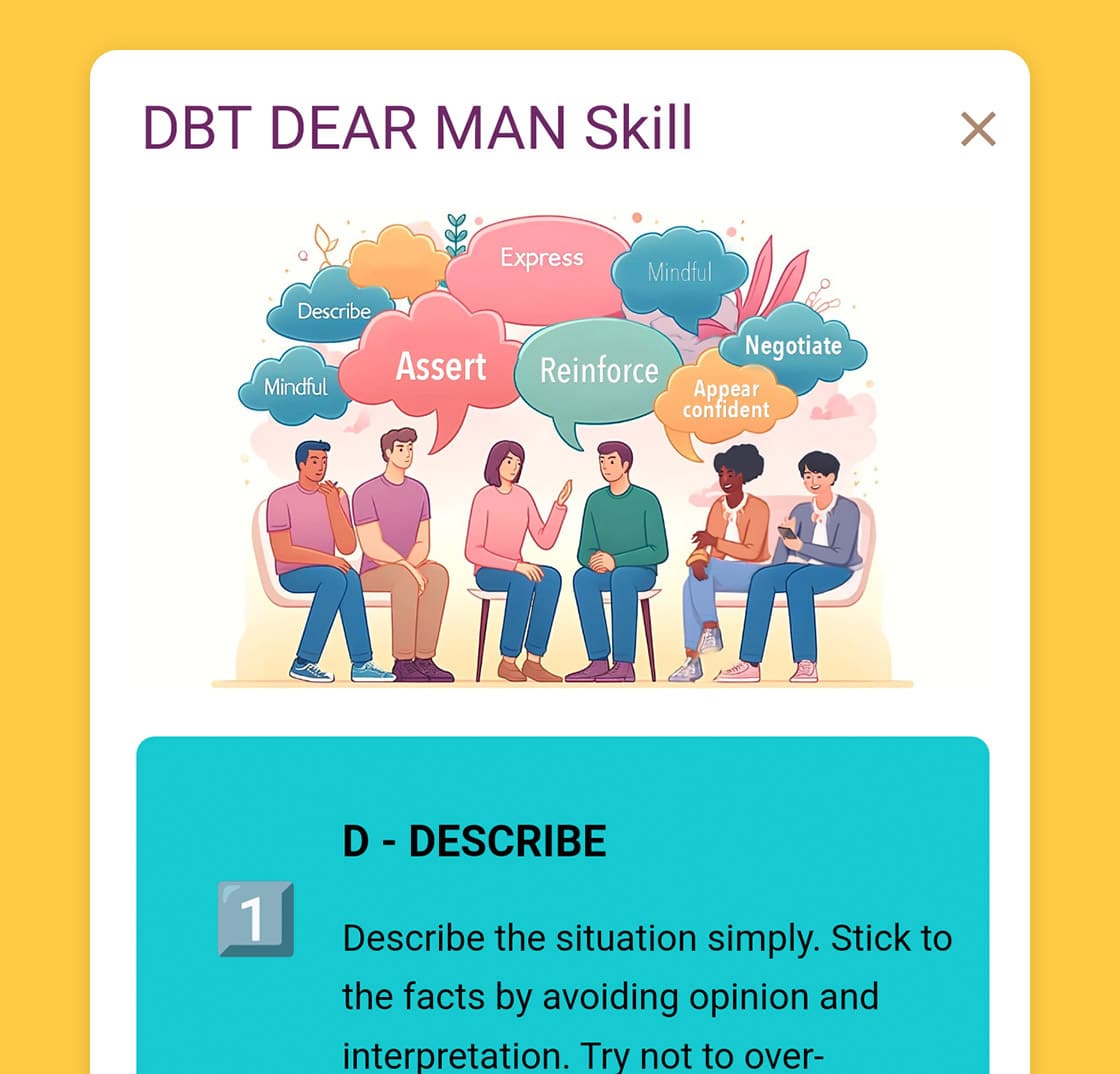 The DEAR MAN DBT therapy Infosheet teaches a simple communication skill designed to help you express your needs assertively while maintaining healthy relationships. DEAR MAN is a structured approach used in Dialectical Behavior Therapy (DBT) to help clients navigate difficult conversations, set boundaries, and advocate for themselves without escalating conflict. This infosheet provides a step-by-step breakdown of DEAR MAN to help you apply the skill effectively. Therapists can share this resource through the Reflective app for client engagement and personal practice.