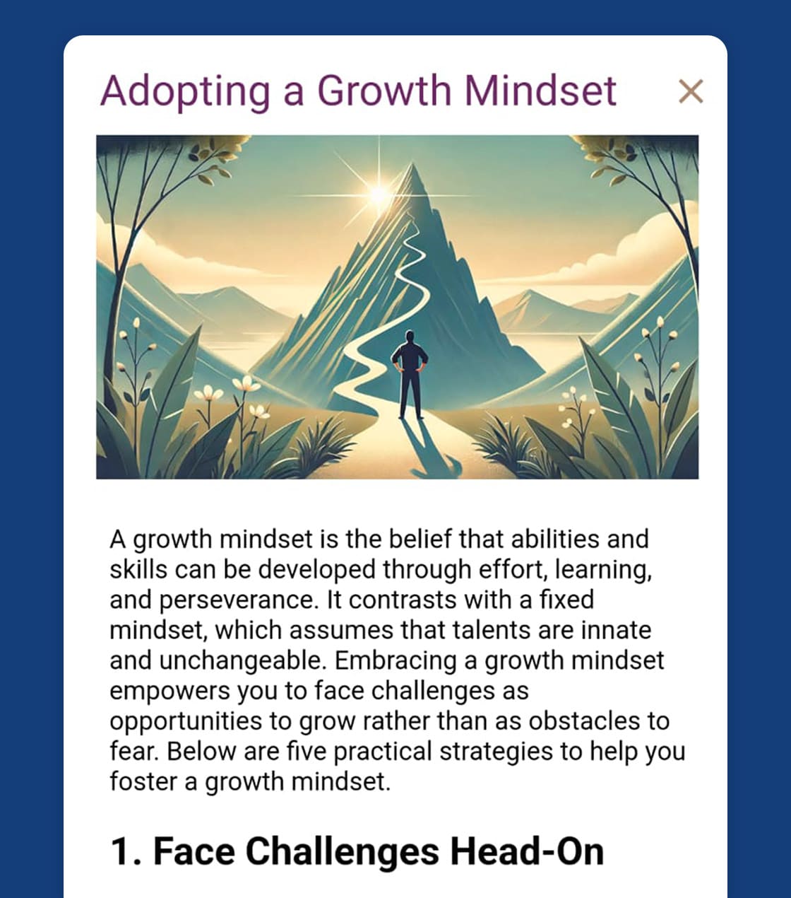 Share the Adopting a Growth Mindset infosheet with your client using the Reflective app so they can review psycho-educational material between sessions. Simply enter their email, and they’ll be able to read and review it from the convenience of their phone. Free trial!