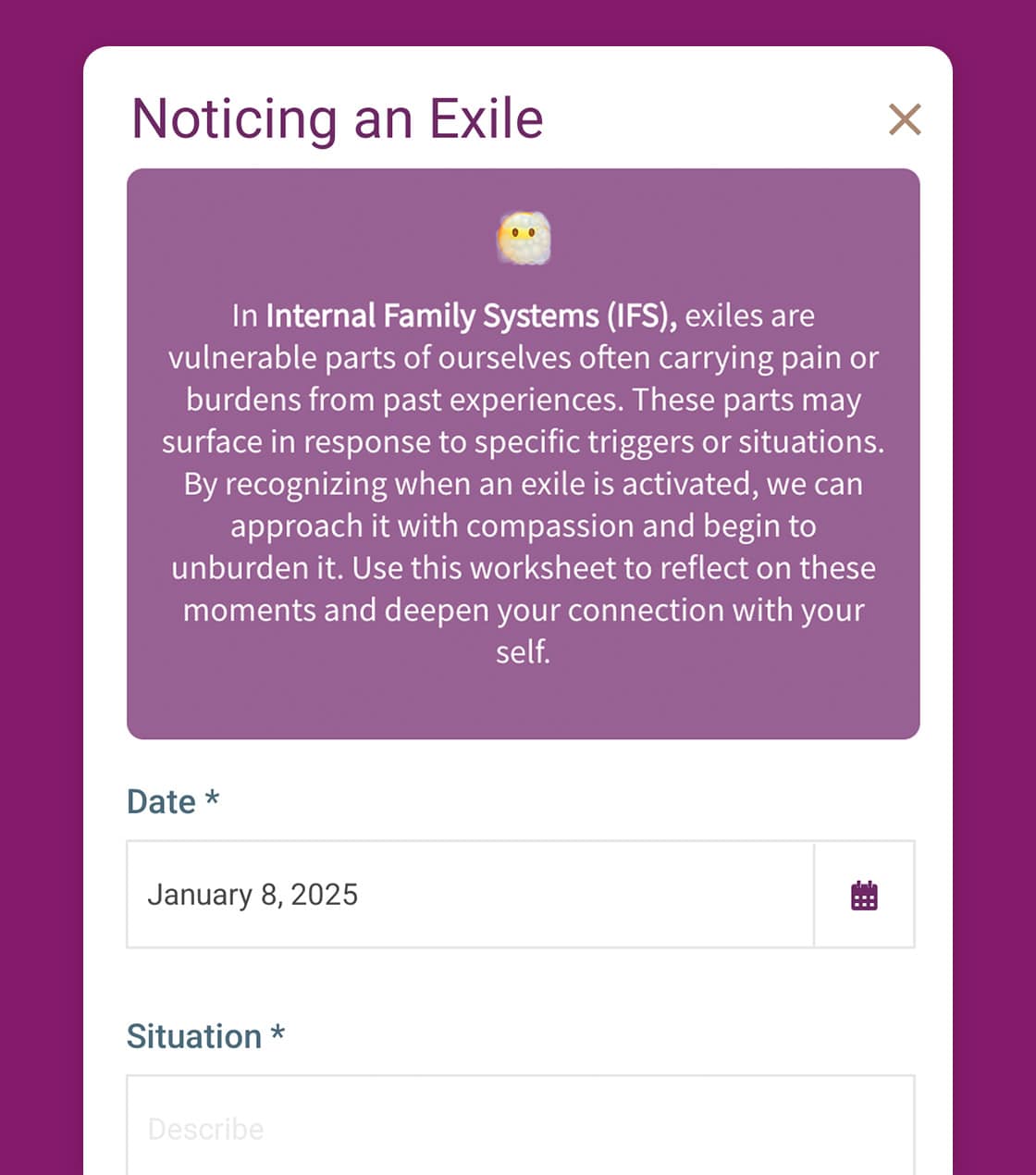 Share the IFS Noticing an Exile worksheet with your client using the Reflective app so they can build awareness of their exiles between sessions. Simply enter their email, and they’ll be able to fill in the worksheet from the convenience of their phone. Sign up for a Free trial.