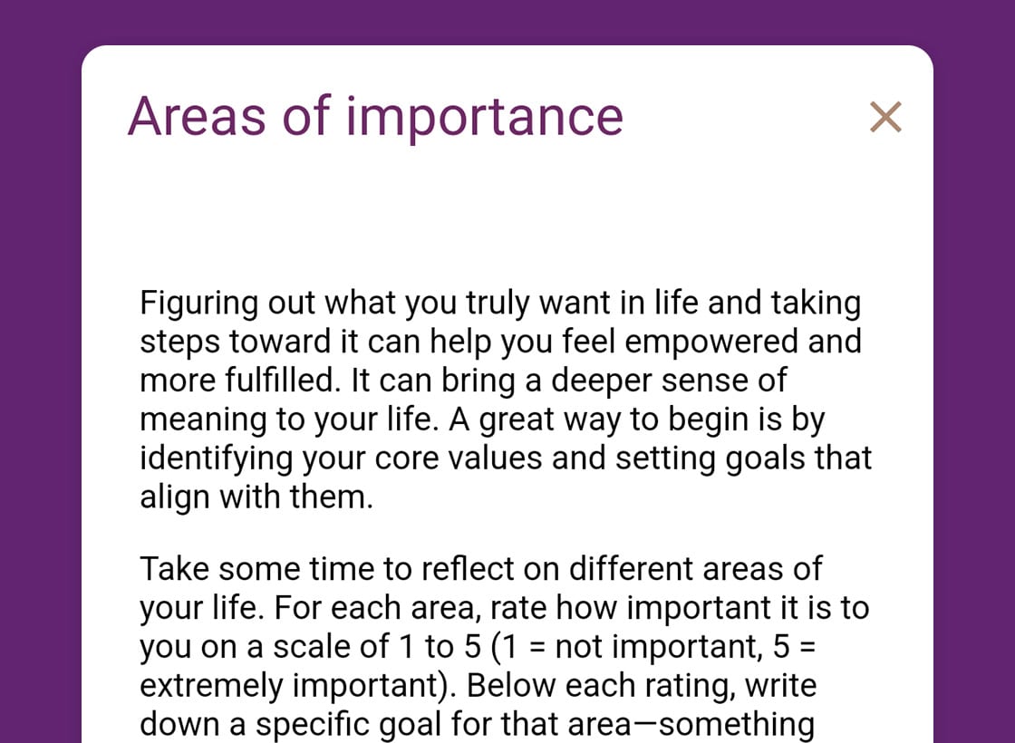 Help your clients discover clarity and purpose with Reflective’s Personal Meaning and Direction writing exercise. This engaging tool guides clients to evaluate and rate key areas of their lives—family, friends, career, and more—empowering them to reflect on what truly matters and identify the direction they want to pursue. With Reflective, you can effortlessly assign and share this exercise, enabling clients to gain deeper insights between sessions while staying connected to their progress. Simplify your practice and inspire meaningful growth—sign up today to explore this transformative resource.