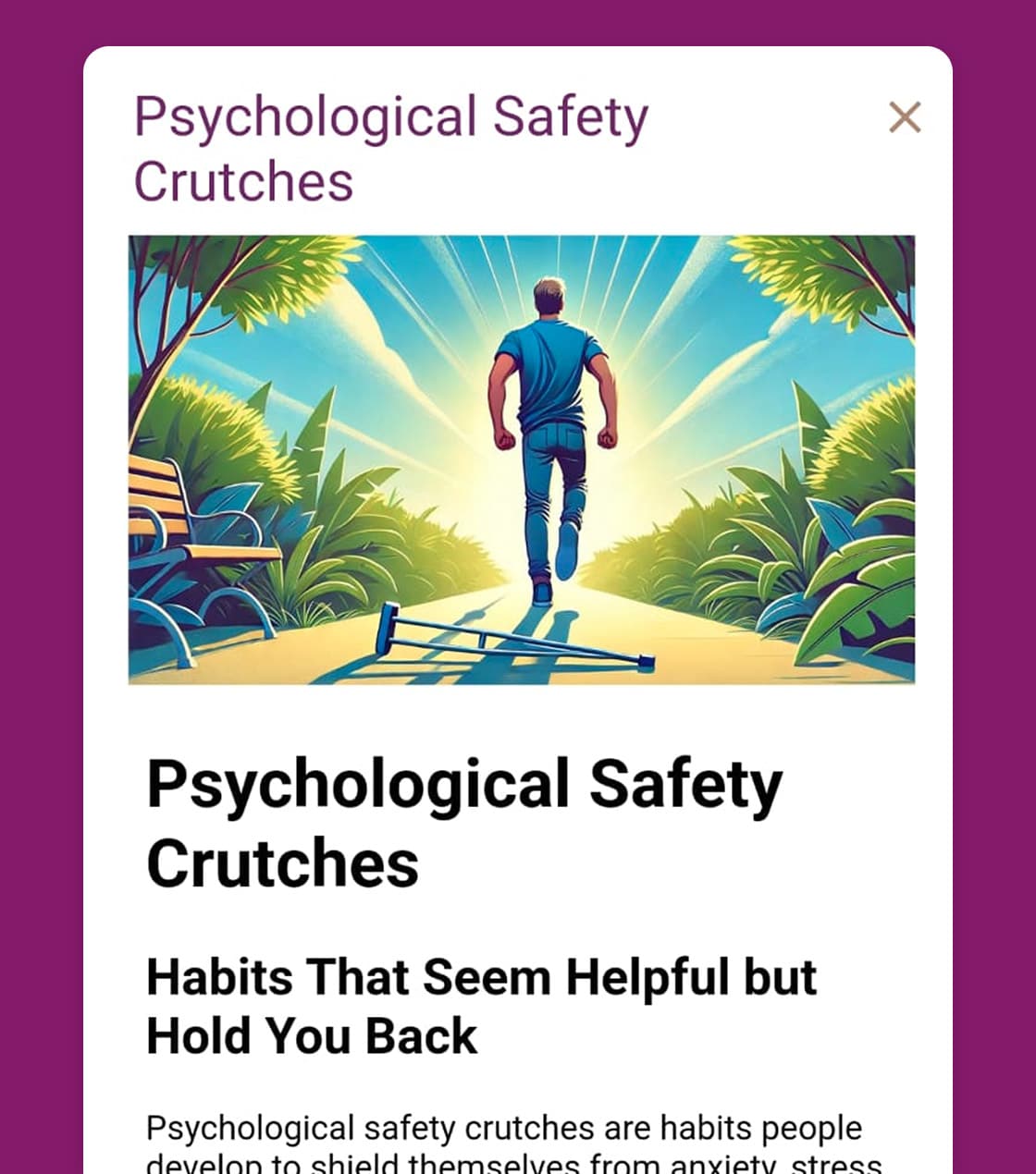 The “Psychological Safety Crutches Infosheet” helps clients understand the behaviors and habits they use to avoid discomfort and emotional challenges. It explains how these “crutches” can provide temporary relief but often hinder growth and long-term progress. By recognizing these patterns, clients can begin to explore healthier ways of coping and building resilience. Therapists can share this resource through Reflective, sparking client awareness and meaningful discussions to support their journey toward lasting change.