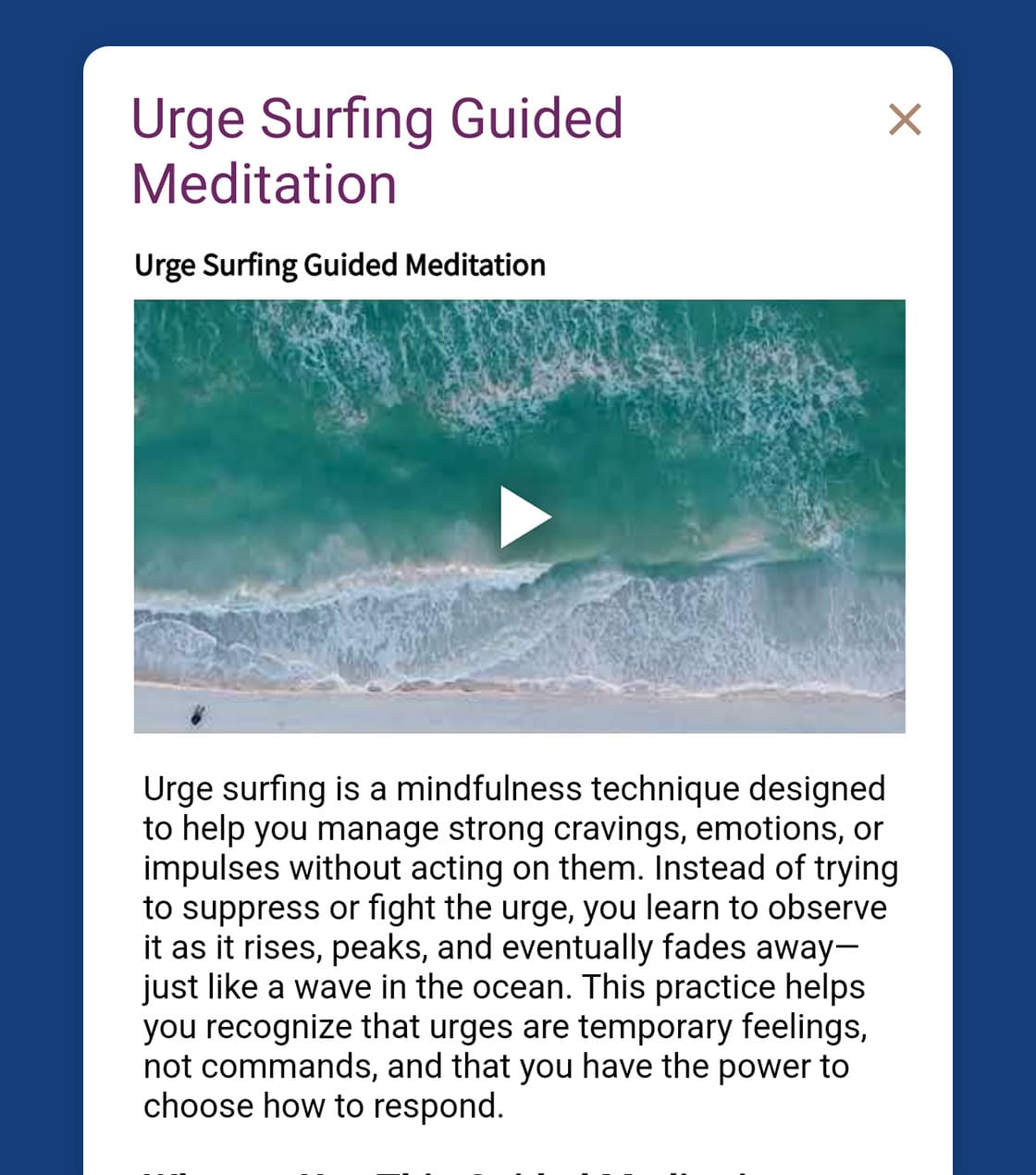 - Accessibility: Clients can use meditations anytime and anywhere, making it easier to practice urge surfing in high-stress moments.