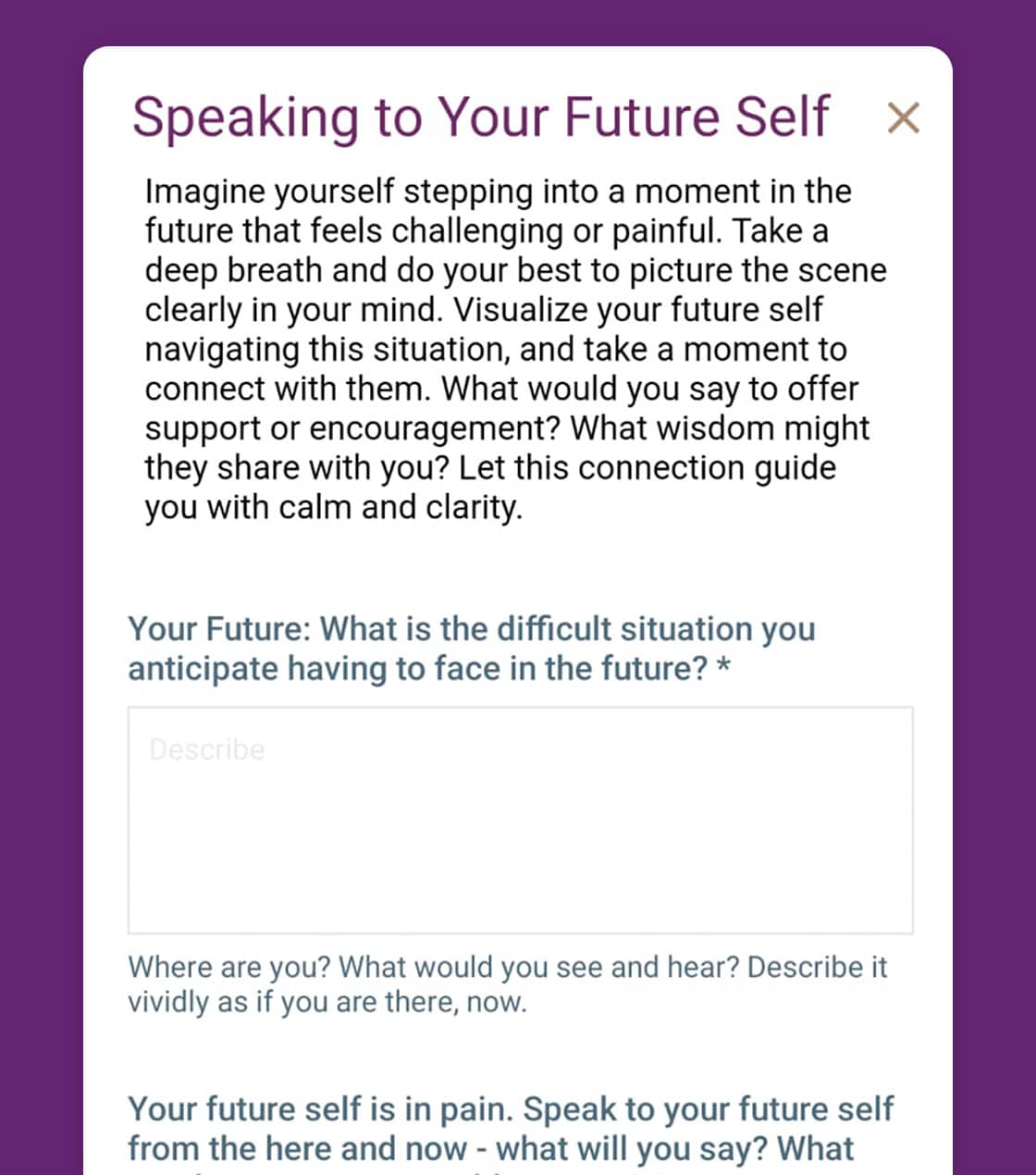 The “Your Future Self” is a therapy worksheet designed to help clients practice self-compassion and acceptance during difficult times. Rooted in Acceptance and Commitment Therapy (ACT), this worksheet guides clients to write a kind, supportive letter to their future self, offering encouragement and understanding for moments of pain or struggle. By fostering self-compassion, this exercise helps clients build resilience and strengthen their connection to their values. Therapists can share this worksheet directly through Reflective, empowering clients to use it as a meaningful resource during challenging moments.
